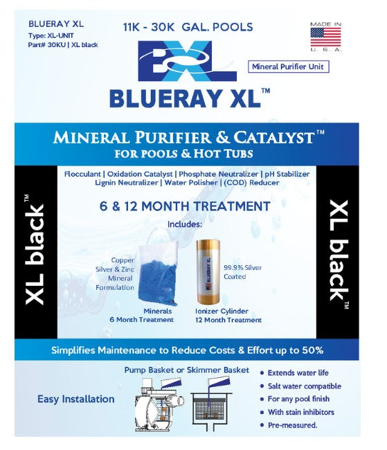 Blueray XL™ 11,000 - 30,000 Gallon - XL black Unit Includes (1) 12 Month Ionizer & (1) 6 Month Mineral Treatment. Blueray XL - The Real Mineral Purifier™, The only Silver, Copper & Zinc Mineral Purifier & Catalyst™. 7 in 1 benefits include: Flocculant, Oxidation Catalyst, Phosphate Neutralizer, Water Polisher & Chemical Oxygen Demand (COD) Reducer.