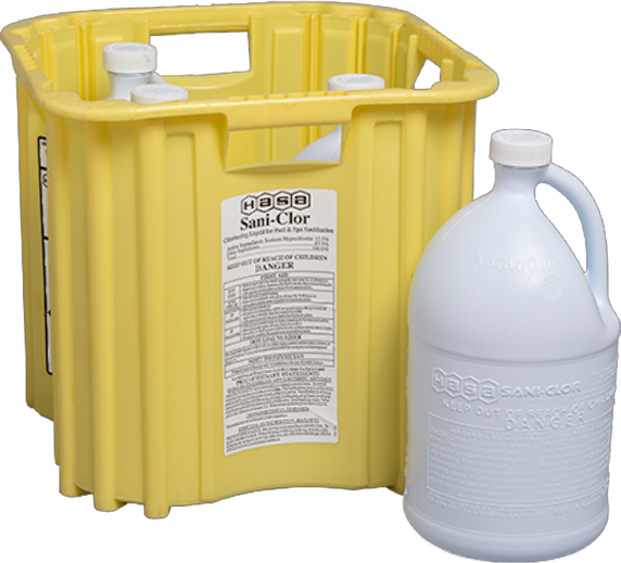 HASA Sani-Clor is a 12.5% sodium hypochlorite solution for use in the treatment of water in swimming pools and hot tubs. When introduced into a swimming pool or hot tub it is immediately available to destroy algae, bacteria, viruses, and other microorganisms.